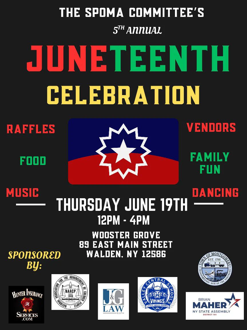 SPOMA Committee's 5th Annual Juneteenth Celebration will be held on Thursday, June 19, from 12 p.m. to 4 p.m. at Wooster Grove, 89 East Main Street, Walden, NY 12586.