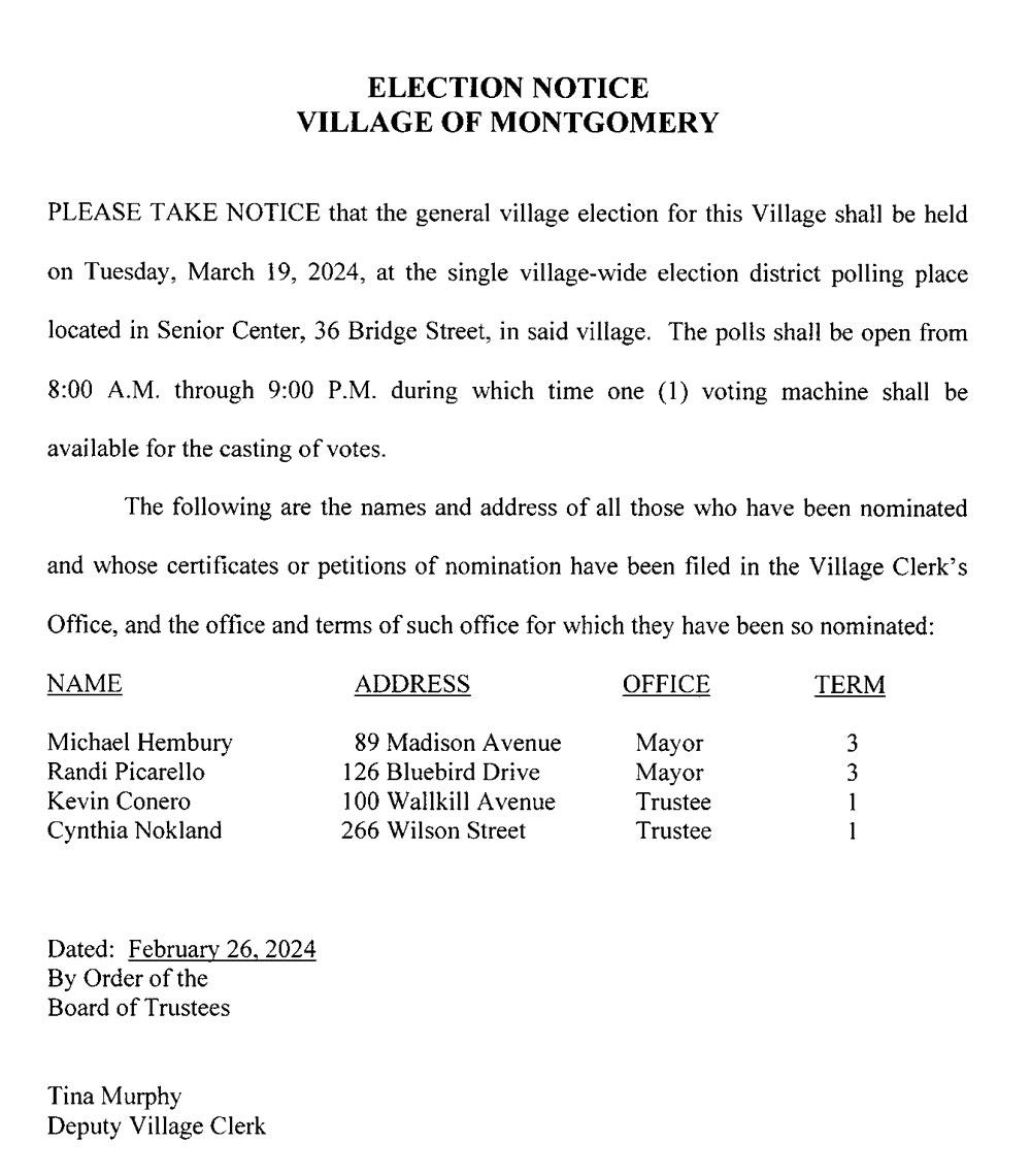 ELECTION NOTICE VILLAGE OF MONTGOMERY